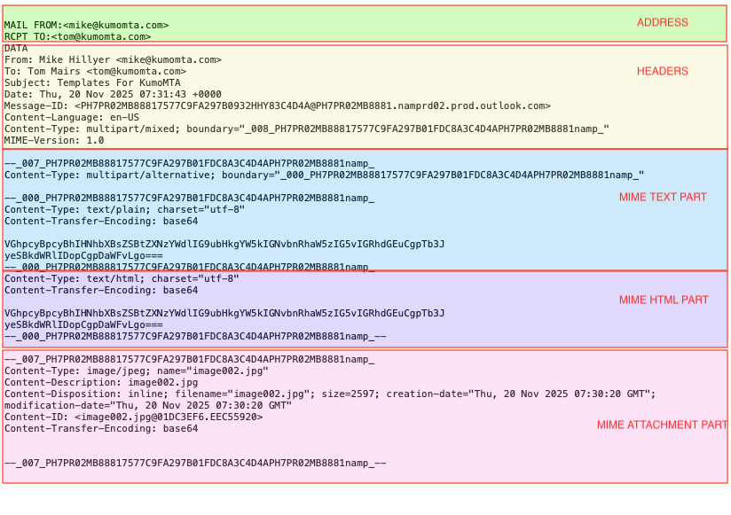 In the last release, kumod 2025.10.06-5ec871ab, we introduced an in-line MIME parser that gives users the ability to decompose a message into its MIME parts. The result of running the 'parse_mime' function on the message object is a table that contains all the separate MIME parts of the message. These can be easily evaluated and modified as strings using the regex and string handling routines we added in earlier releases.